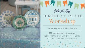 Join us in creating custom birthday plates on Thursday, March 12th at our Birthday Plate Workshop from 6-8pm.