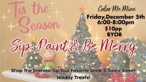 It’s the most wonderful time of the year to get creative! Join us at Color Me Mine for a jolly night of painting, sipping, and spreading holiday cheer.